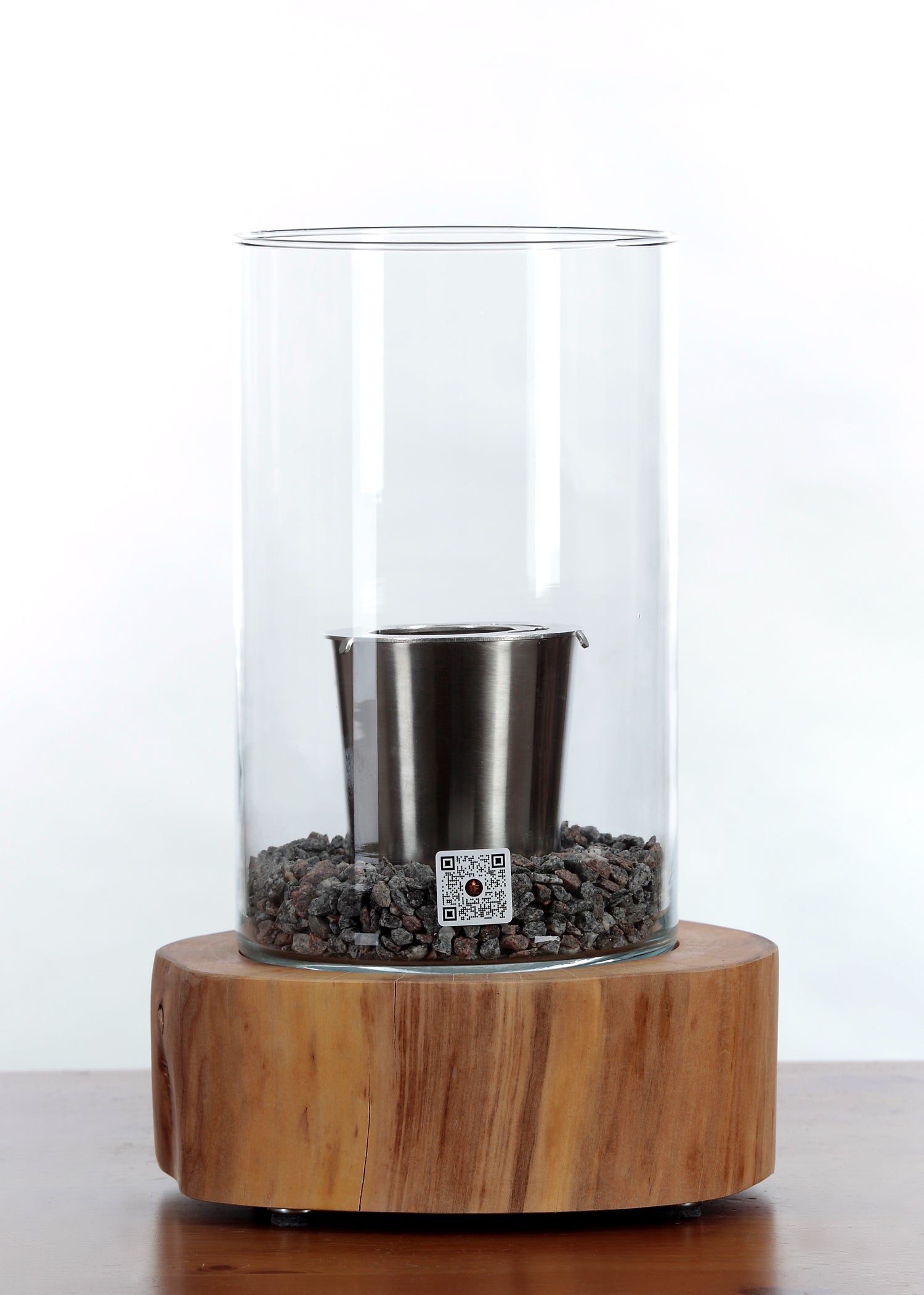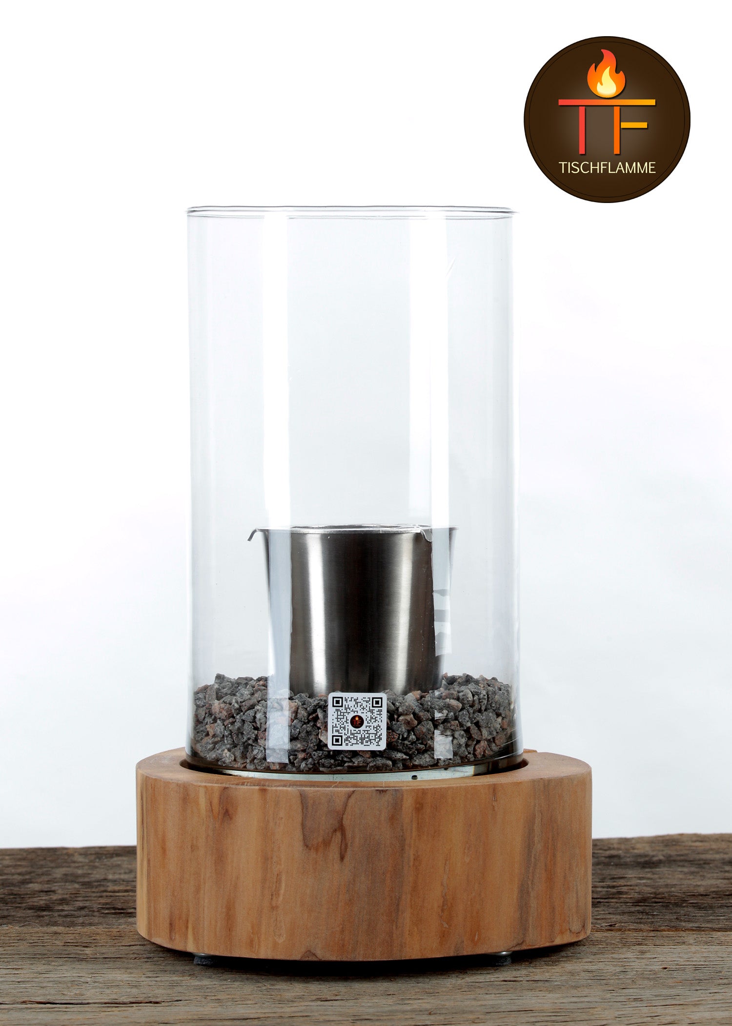 Holzsockel mit Filzgleitern, Schutzglas, Edelstahl Brennbecher + Brenndeckel, Dämmkies, Ablöscher , 1Liter Brenngel, 50 lange Streichhölzer, Reinigungsschwamm, Anleitung