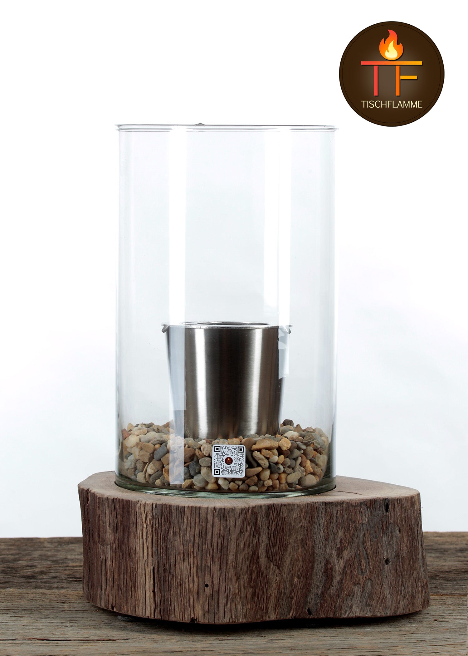 Holzsockel mit Filzgleitern, Schutzglas, Edelstahl Brennbecher + Brenndeckel, Dämmkies, Ablöscher, 1Liter Brenngel, 50 lange Streichhölzer, Reinigungsschwamm, Anleitung